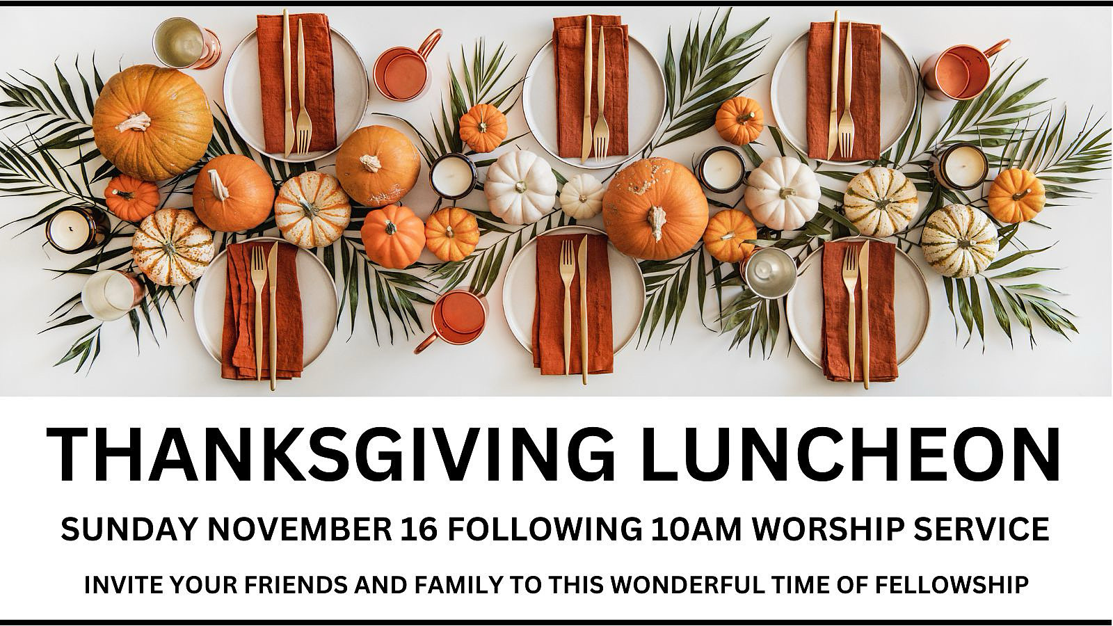 All are invited! Please join us on Sunday, November 16th for our Thanksgiving Luncheon. Sign up to bring a dish at the welcome center!